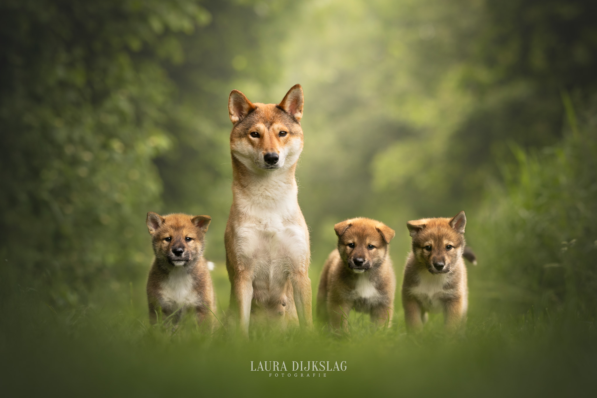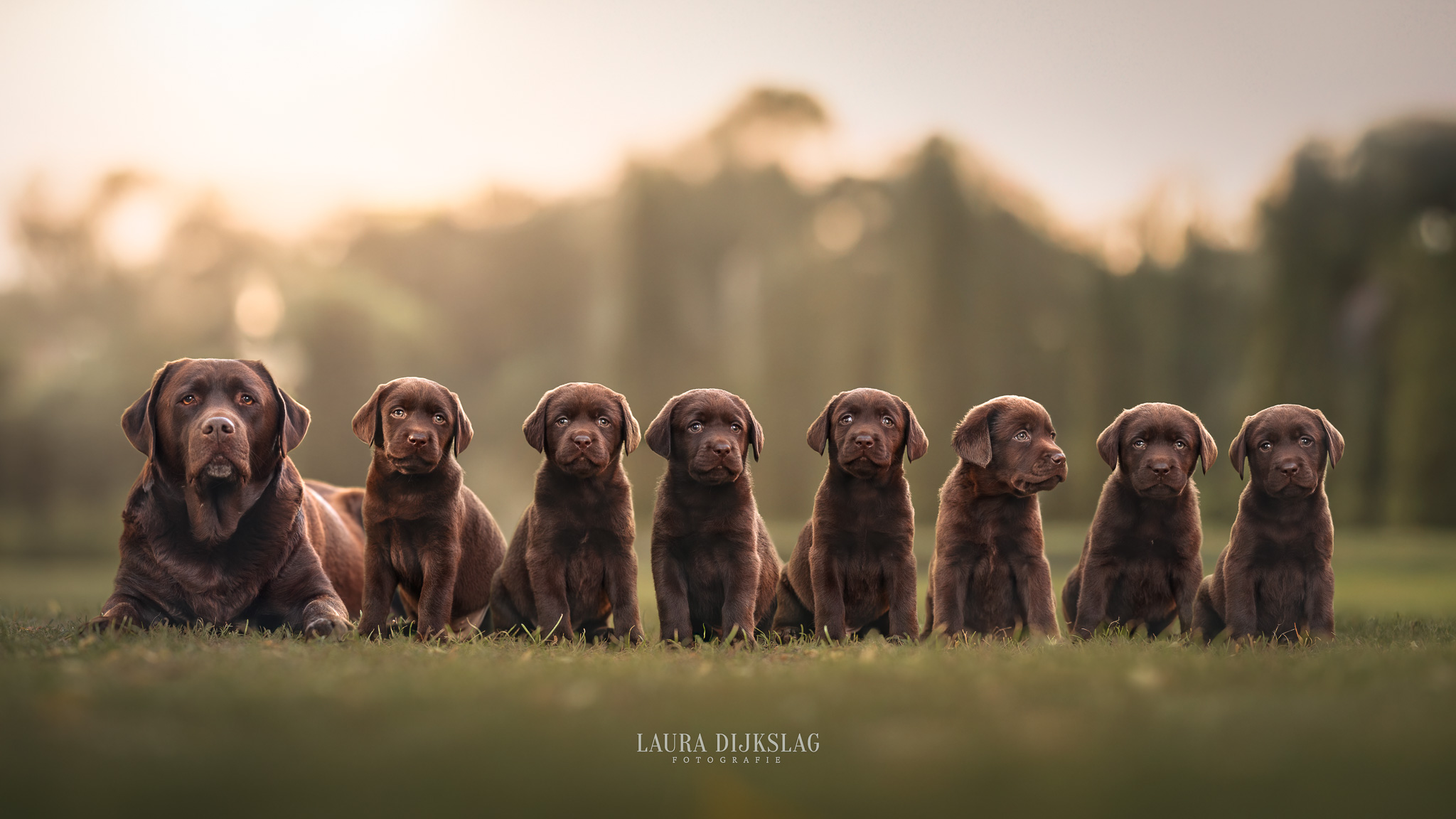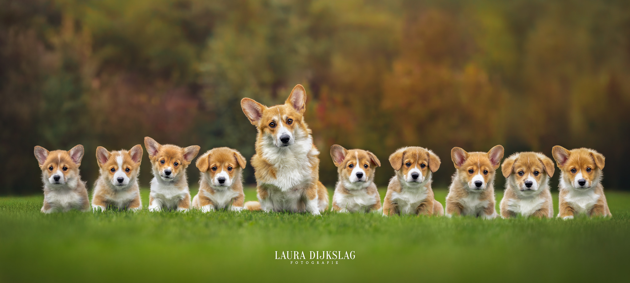 Het fotograferen gaat over het algemeen dus redelijk snel, maar de nabewerking is een ander verhaal. Thuis zoek ik van elk hondje de mooiste foto uit en word het knippen, plakken, passen en meten. Net zolang tot de foto perfect is en je er niks van ziet dat de pups nooit naast elkaar gezeten hebben.